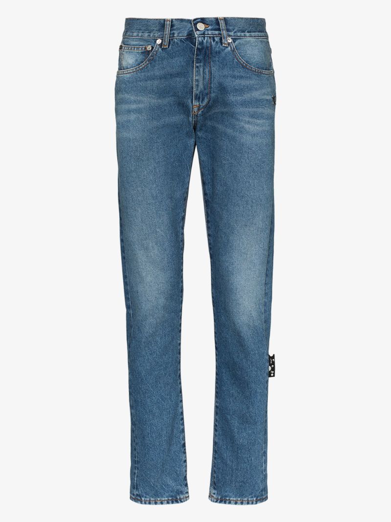 Off-White, five pocket jeans, embroidered details on the back, leather patch on the back. Made in Italy