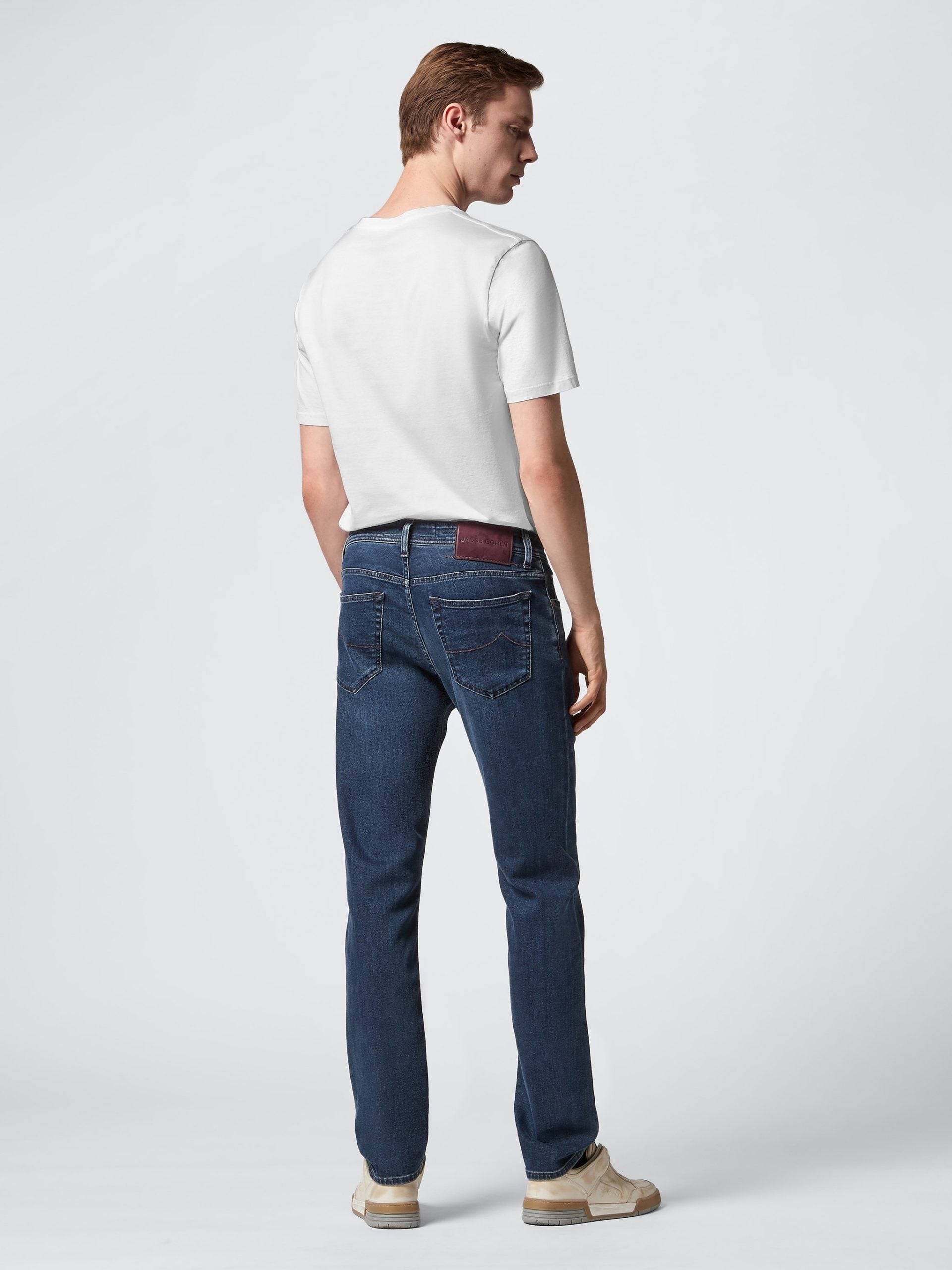 Jacob Cohen denim, modrá barva, design s pěti kapsami, semišová nášivka na zádech, zapínání na knoflíky vpředu, regular fit. Vyrobeno v Itálii